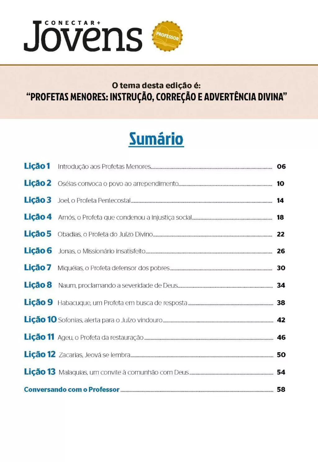 Neste Trimestre, a Revista Conectar + Jovens traz a temática: “Profetas Menores: Instrução, Correção e Advertência”, com o intuito de mostrar a relevância destes profetas e sua intimidade com Deus. As reflexões que seguem nos oportunizará a visão de que estes profetas foram homens piedosos e tementes a Deus, mesmo vivendo em uma época de crise e decomposição espiritual generalizada. A vasta literatura sobre os Profetas Menores e a Bíblia levam-nos a observação de que estes homens foram a solução emergencial que Deus usou para despertar o Seu povo. Notaremos que a profecia milenar desses profetas tem muito a dizer-nos hoje. Uma análise apurada da vida destes homens é um adequado apoio de sabedoria divina para a Igreja de Cristo, pois nos encorajam a guerrear pelas coisas do Reino de Deus. Nesta ordem de ideias, estudaremos que a mensagem dos Profetas Menores é perfeitamente, válida e atual para os nossos dias.